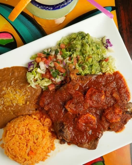 Prepared with chicken, steak and shrimp accompanied with three tortillas, rice, beans, lettuce, guacamole, sour cream and tomato