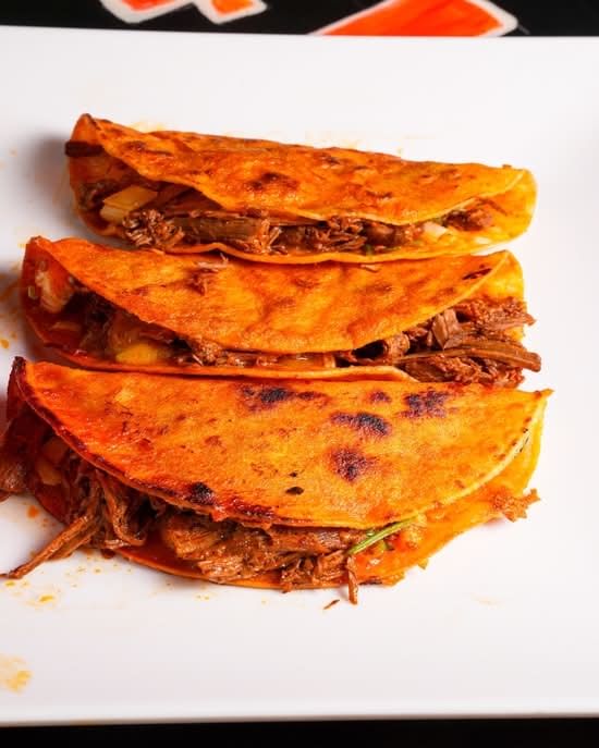 3 traditional slow cooked Mexican beef stew tacos with cilantro and onion. Served with Mexican rice and refried beans