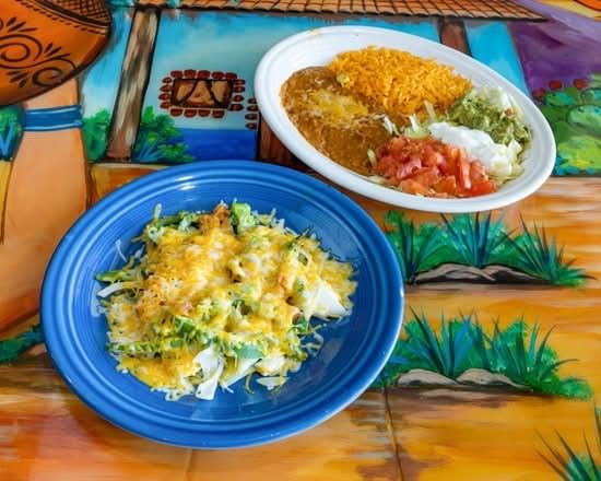 2 grilled chicken and spinach enchiladas covered in cheese sauce, cilantro, and onions. Served with Mexican rice and beans.